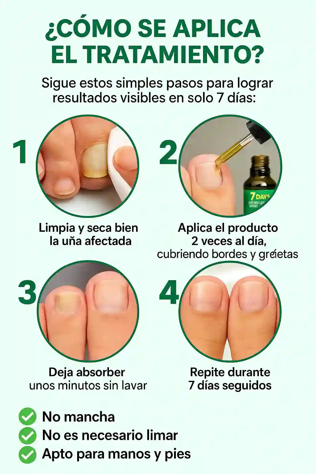❓¿Cuánto dura cada frasco y cómo aplicarlo?✅ Aplicación diaria durante 7 días; un frasco suele alcanzar para el tratamiento. No hay modo exacto, pero se aplica sobre uña limpia.