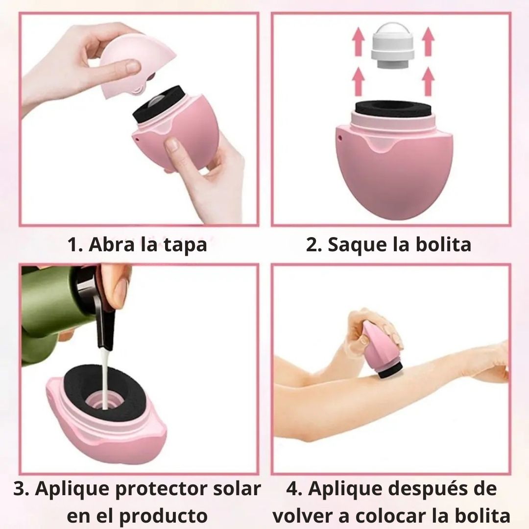 Su diseño compacto e inteligente incluye un rodillo que distribuye el protector solar de manera uniforme y una esponja suave que se desliza delicadamente, evitando exceso de producto y garantizando una cobertura completa.